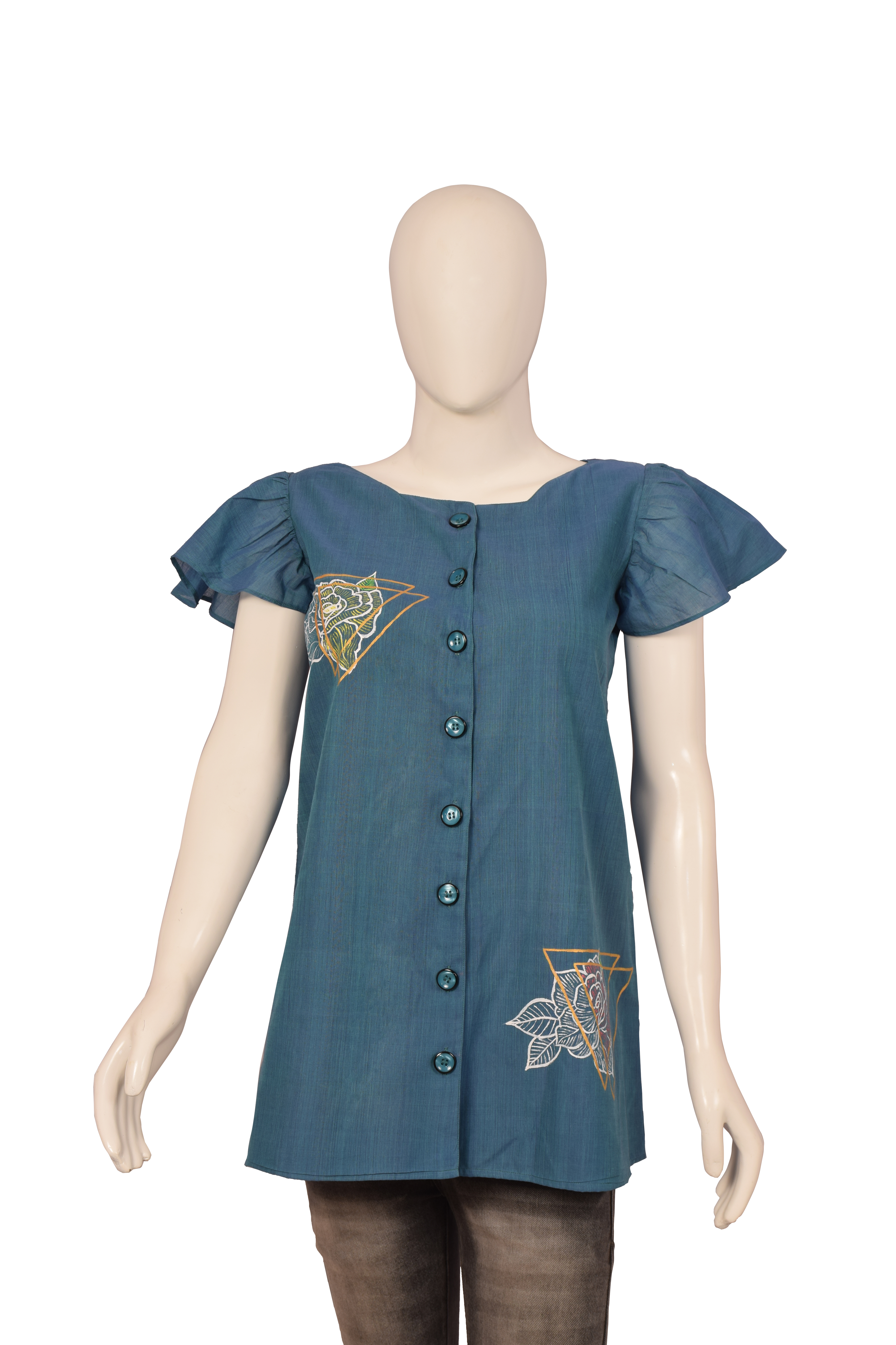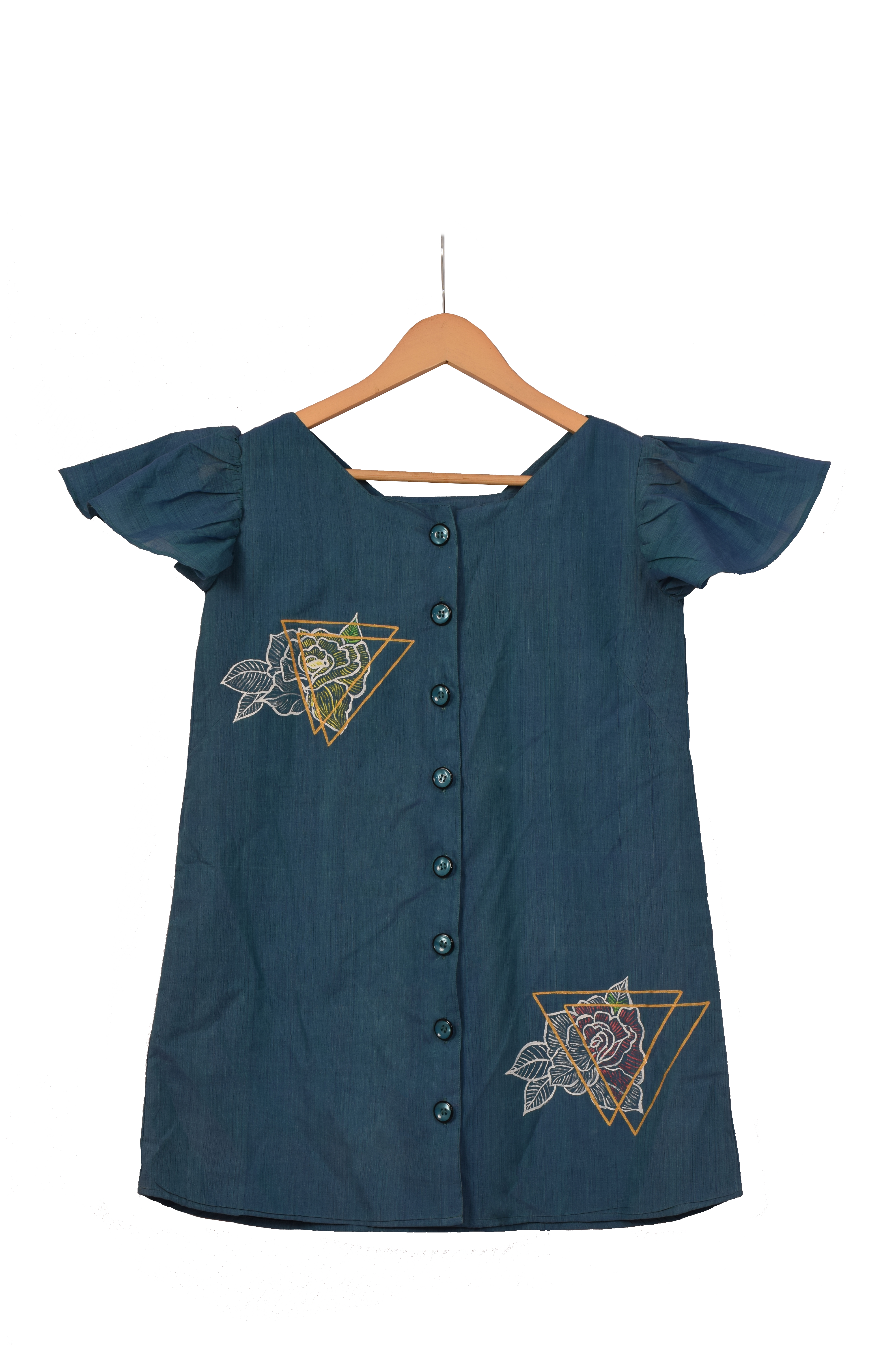 Deep Teal Blue Pochampally Cotton Top with Handpainted Design
